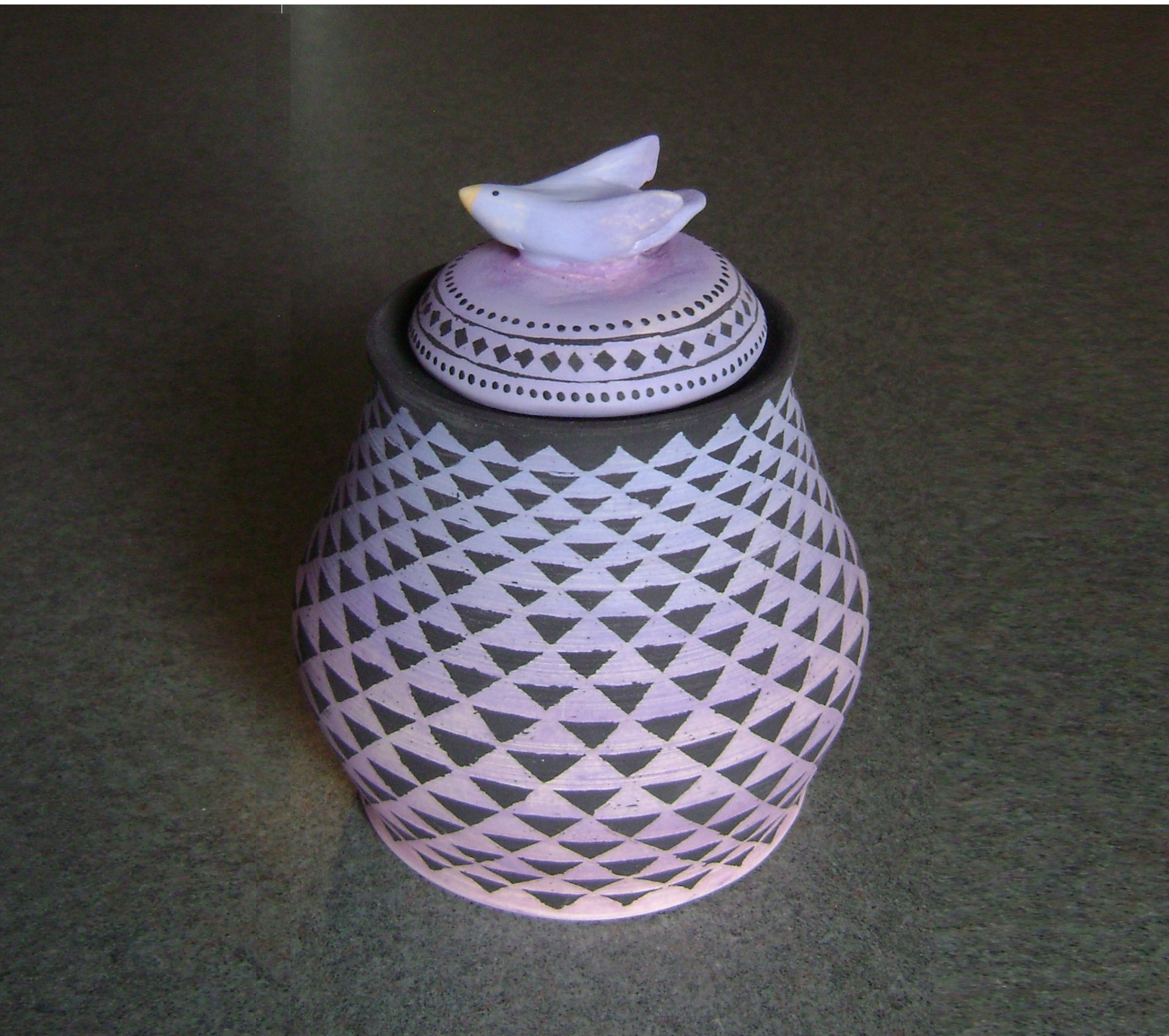 Hand thrown jar, with bluebird and 408 Triangles